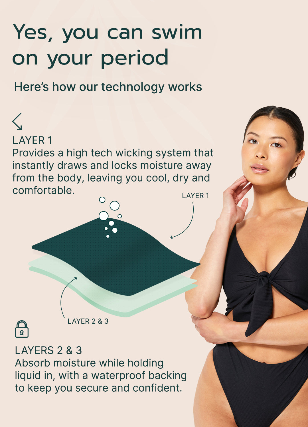 Our swimwear has a cleverly built-in layered absorbency system which features a high-tech gusset - the top layer is breathable and wicks moisture away from the body, an absorbent mid layer that locks moisture in and limits external leaks and a waterproof backing to stop liquid from getting out.